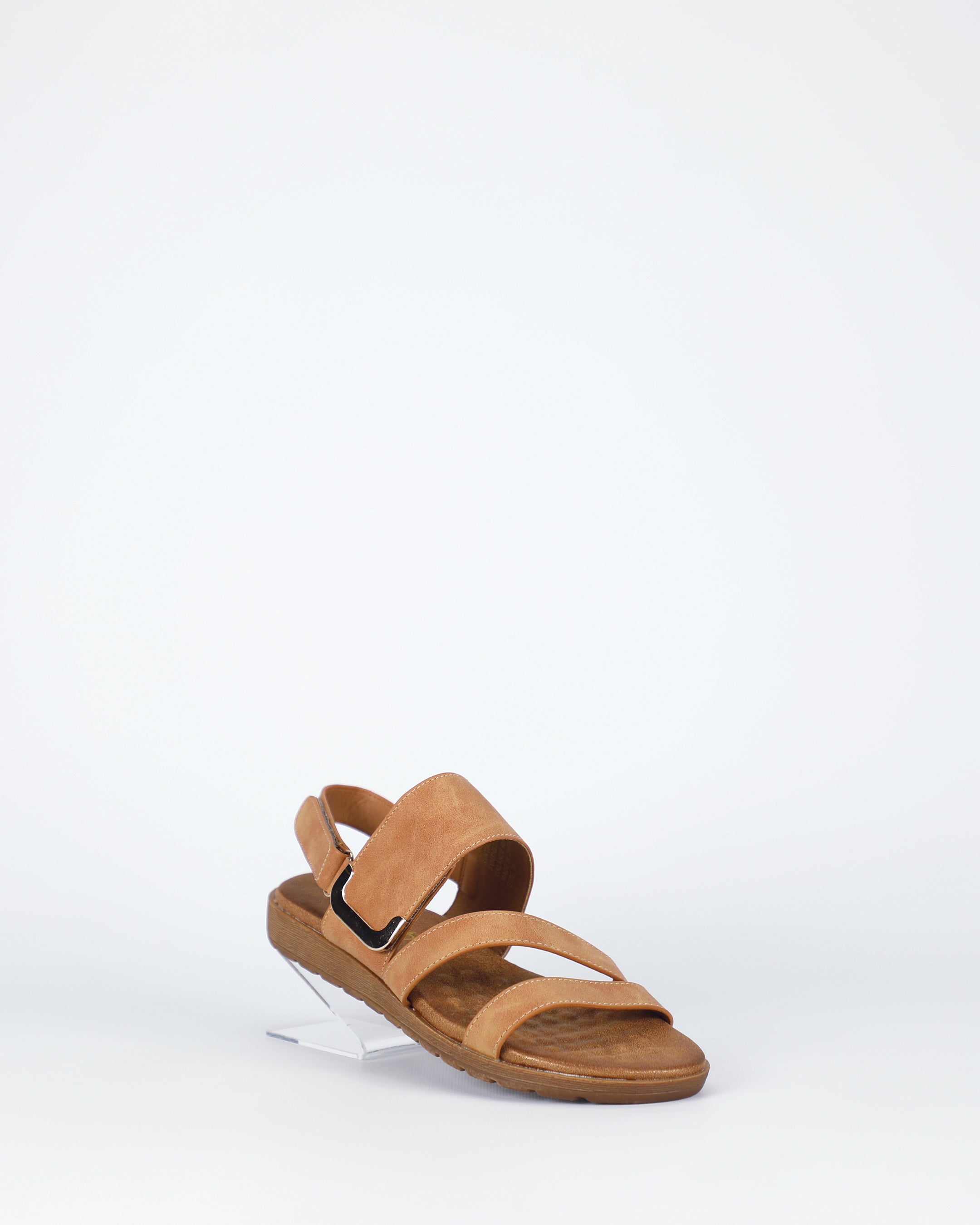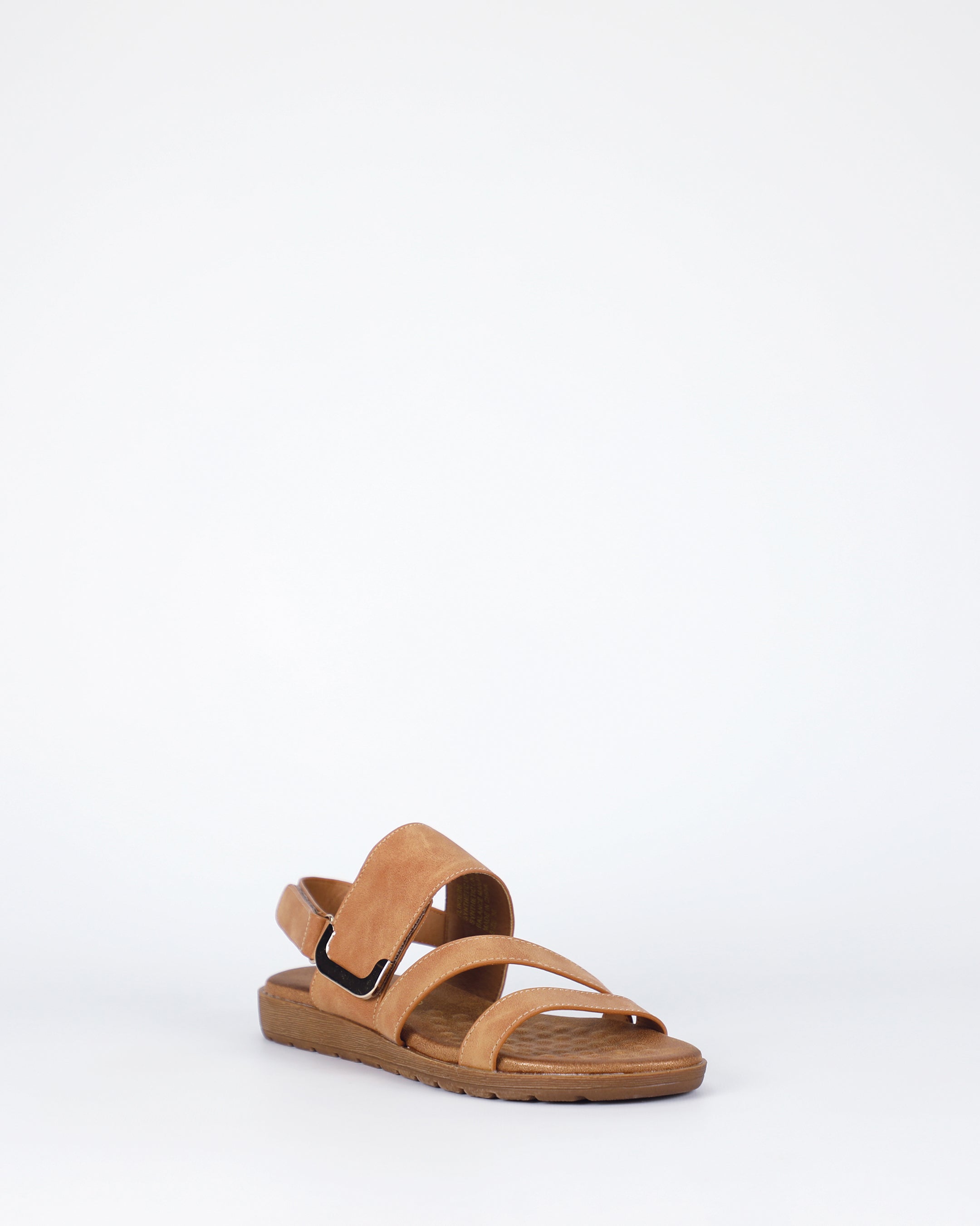 With an adjustable velcro strap for a secure fit, these light tan sandals pair beautifully with linen shorts and a cotton shirt, summer dresses, or cropped jeans for everyday wear.
