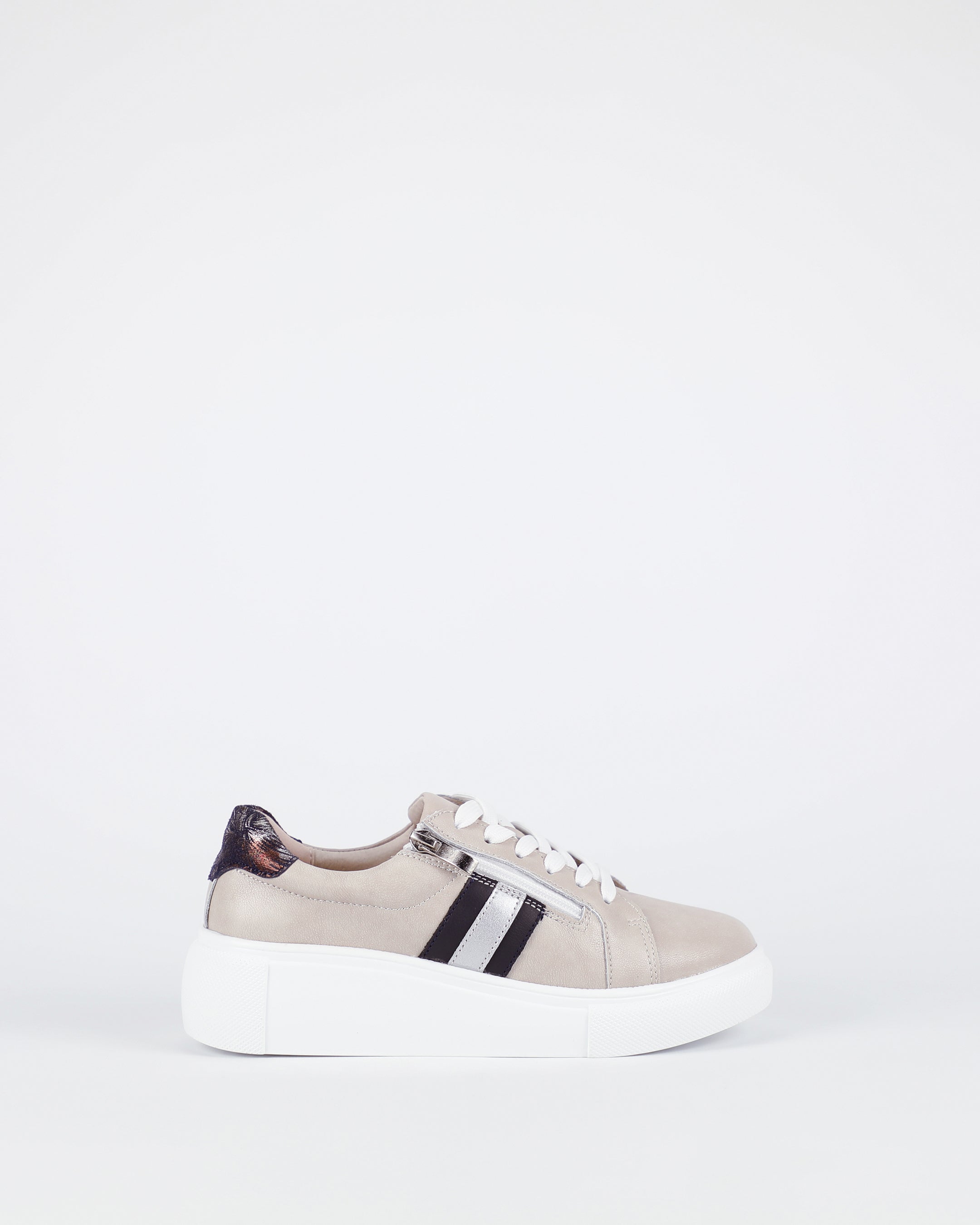 These lace-up stone multi sneakers feature a convenient side zip for easy on-and-off. Their versatile design pairs beautifully with relaxed jeans and a tee, activewear sets, or casual skirts for a laid-back yet polished look.