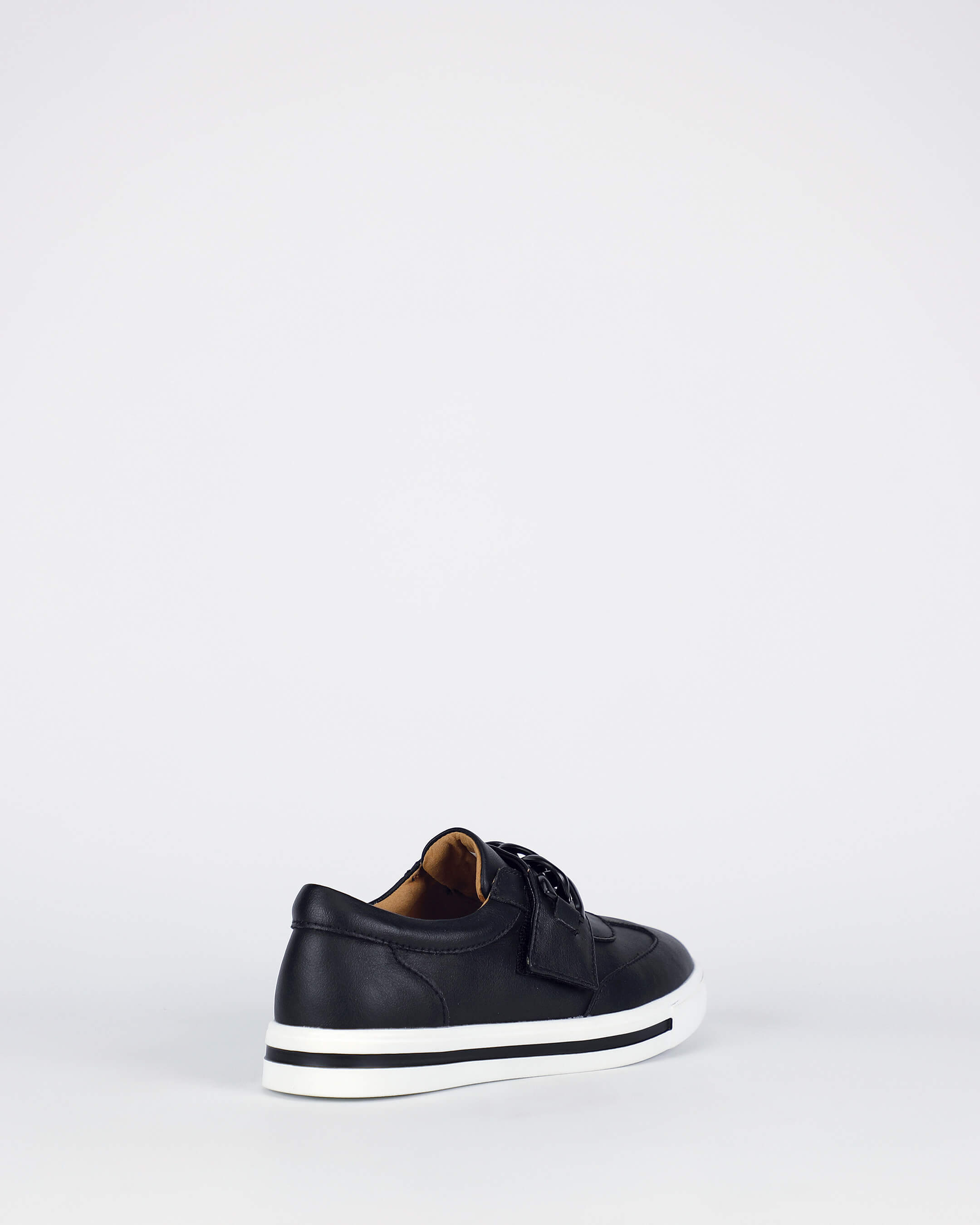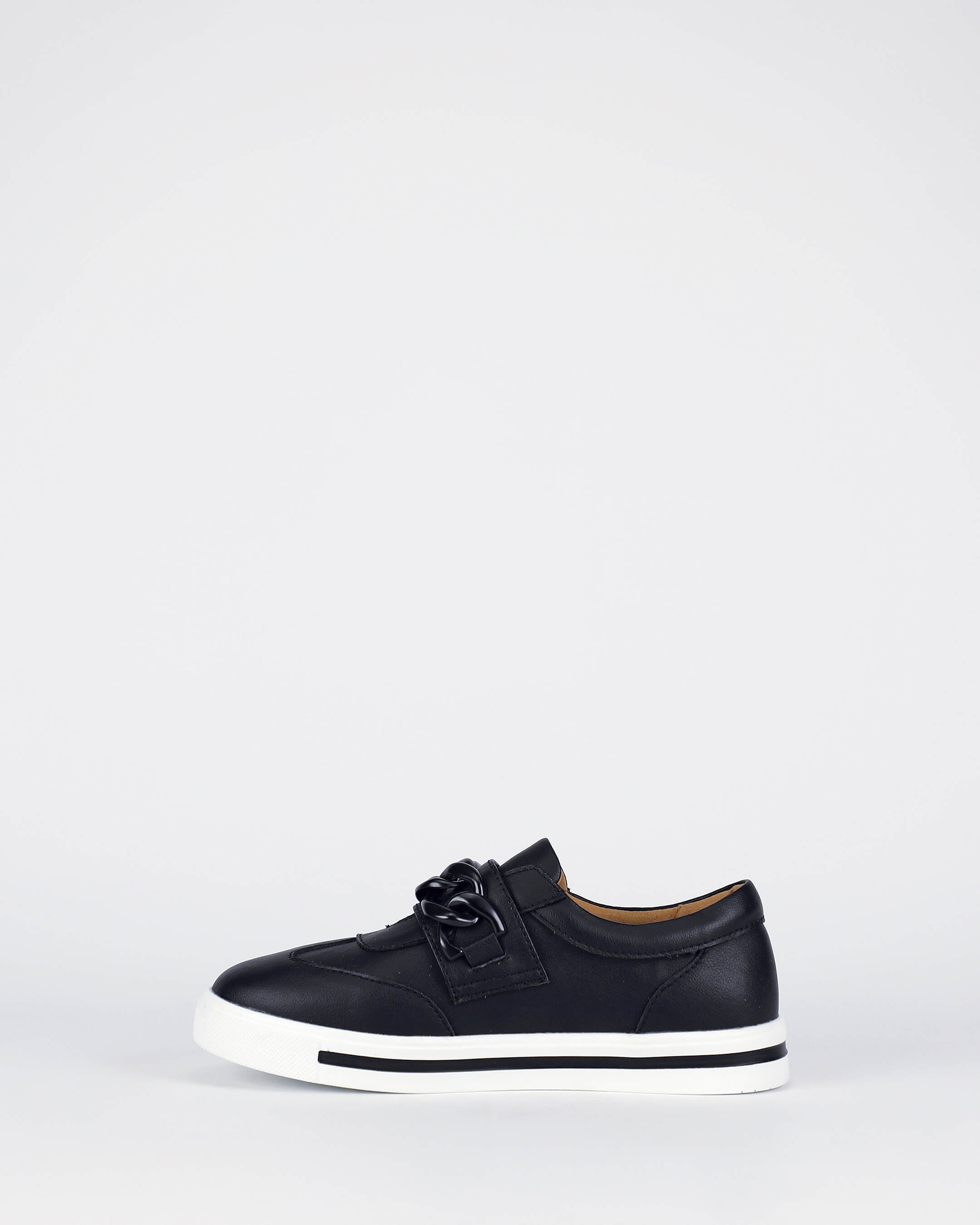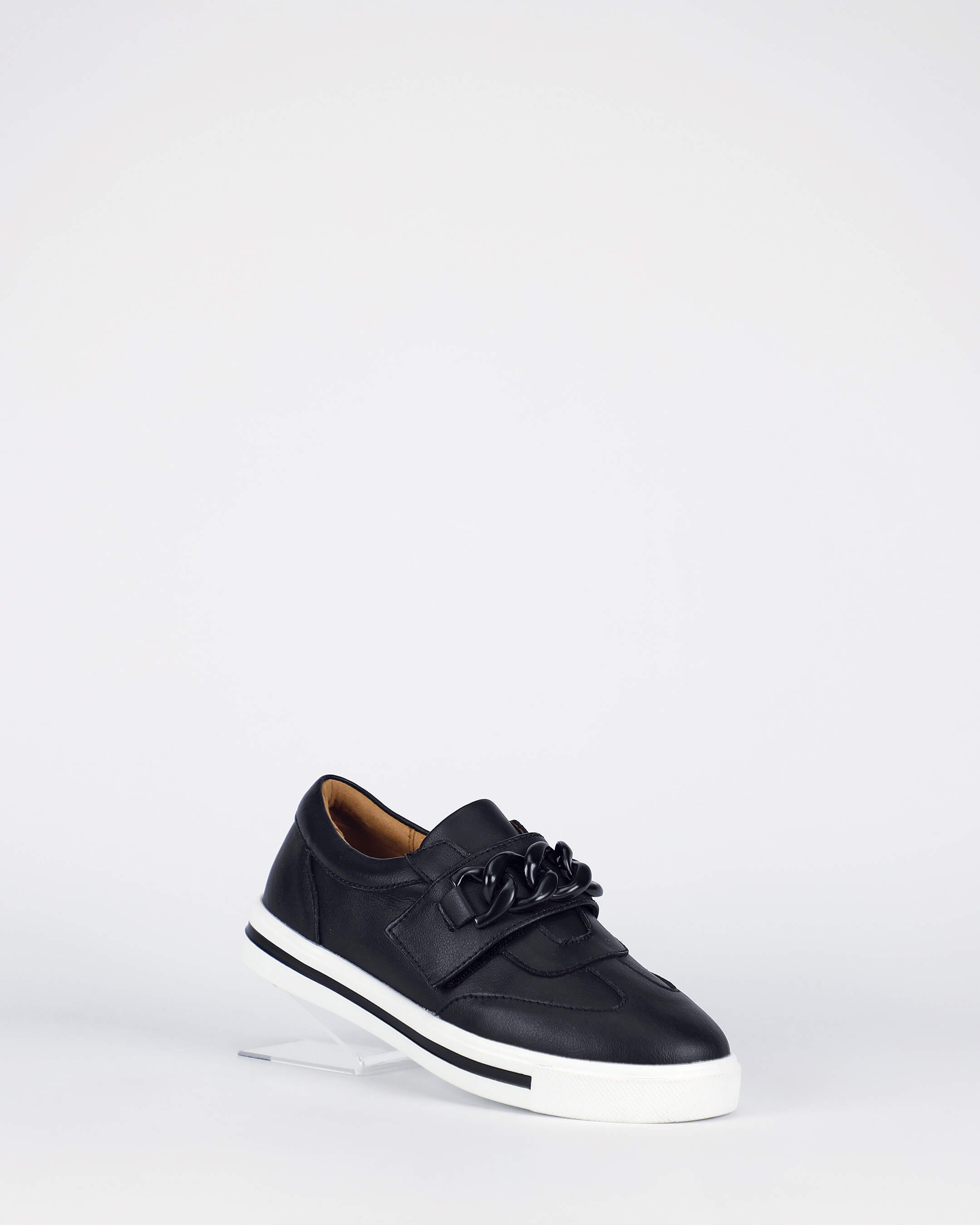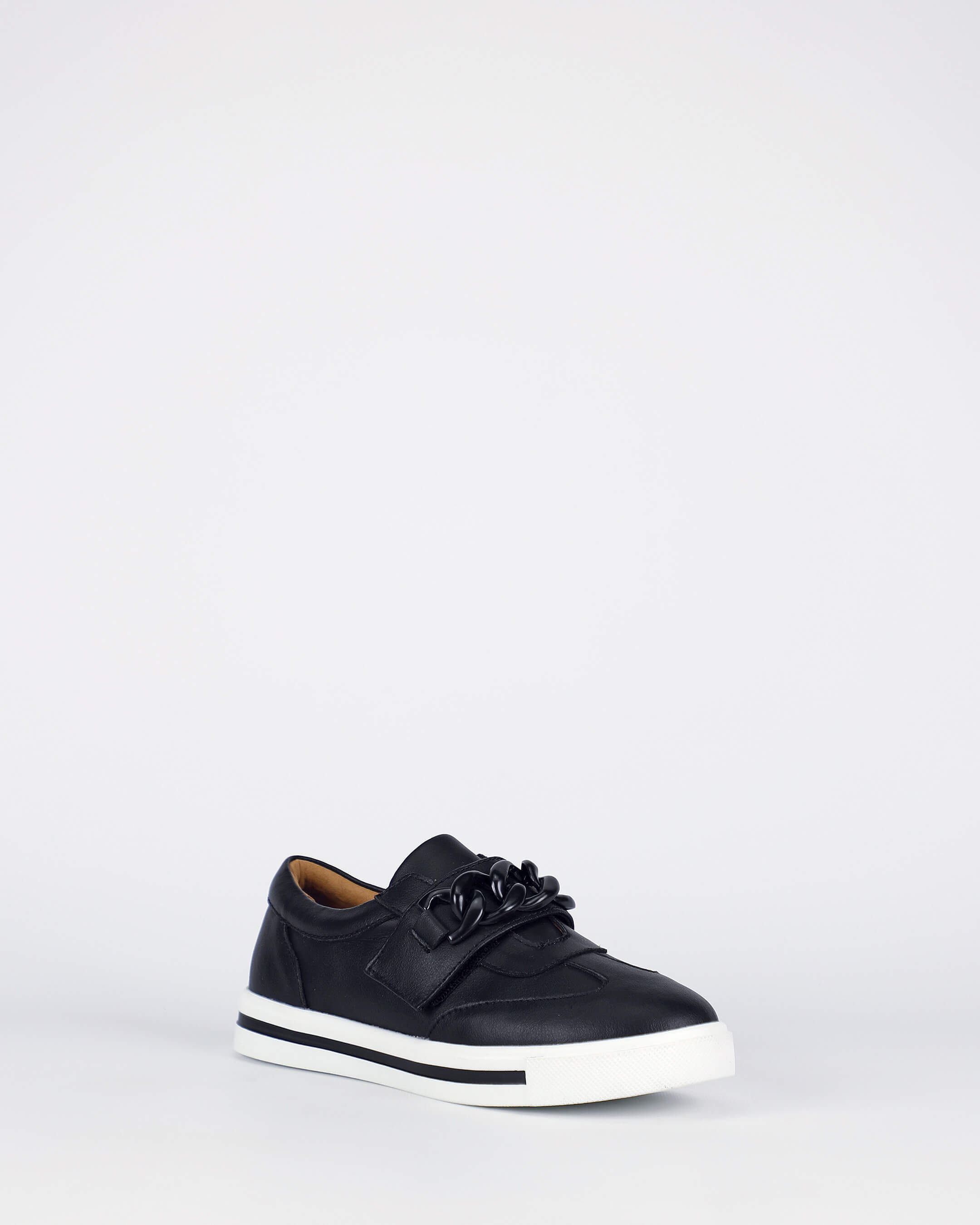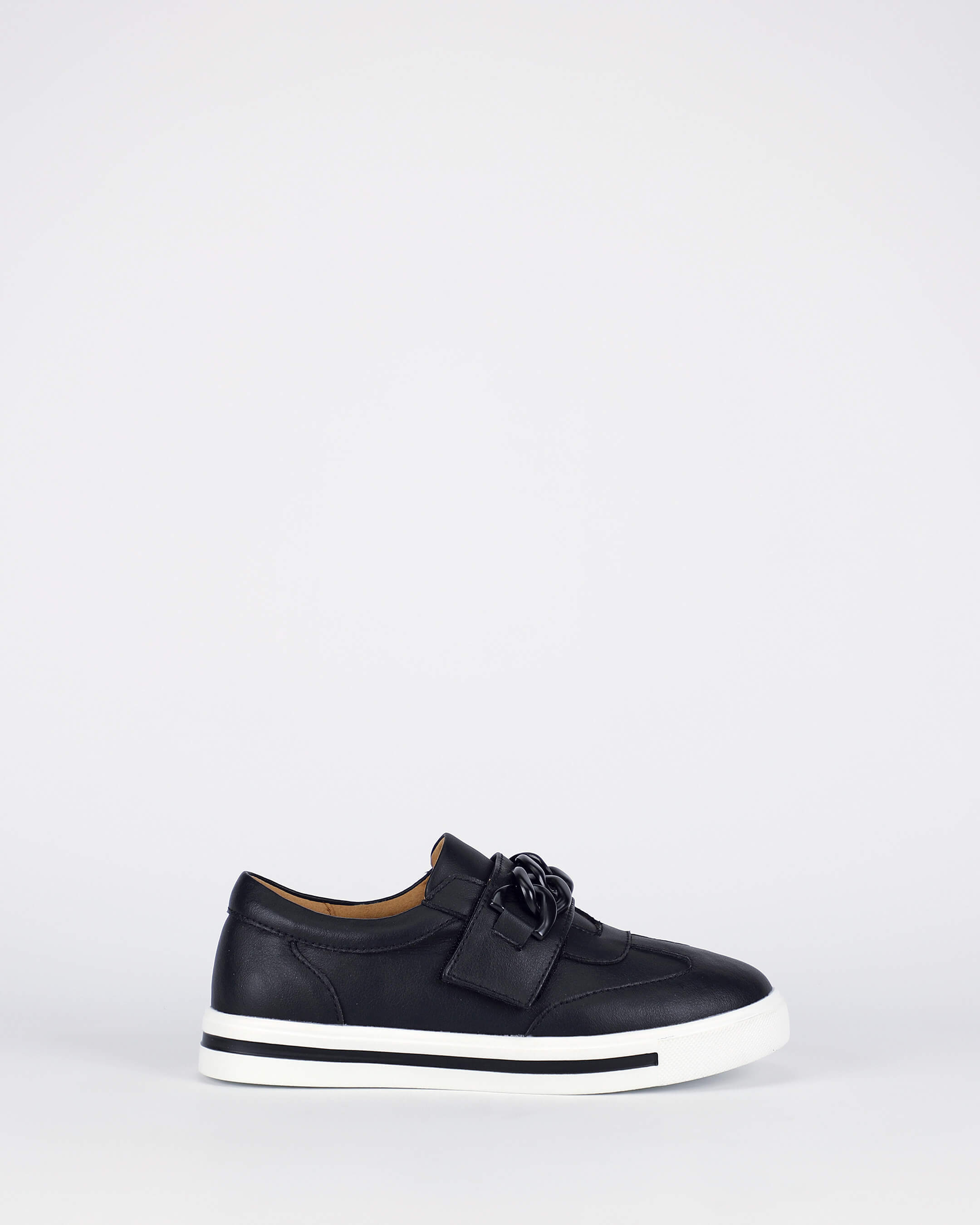 A clean, contemporary sneaker designed to bring statement detail into everyday wear, Krispy blends smooth leather with bold chain hardware for a confident finish. The crisp black upper keeps the look fresh and versatile, balanced by a cushioned sole for dependable all-day comfort.