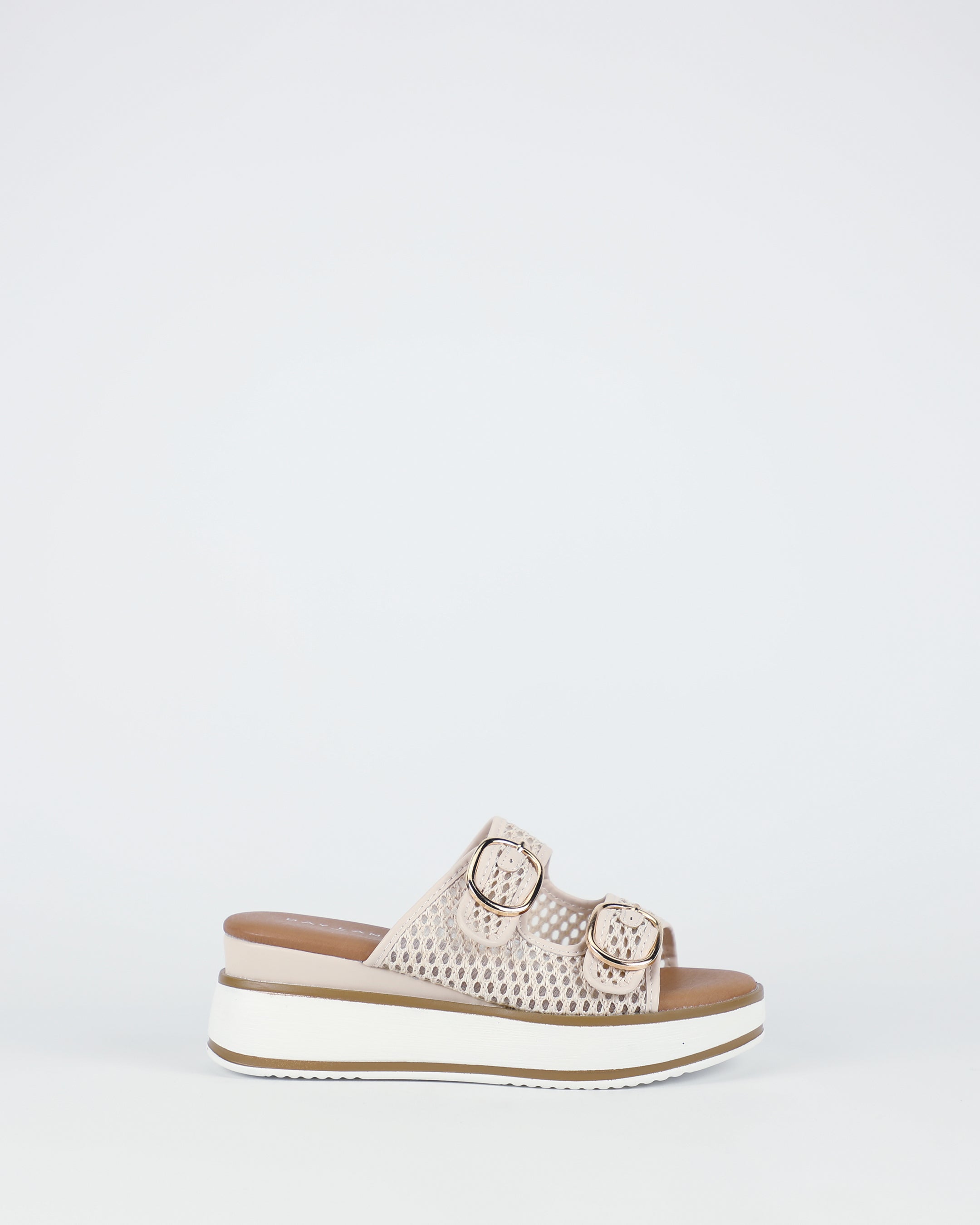 Step into elevated ease with Lima in cream mesh. Featuring airy woven straps and polished gold buckles, it balances lightness with a statement touch. A cushioned footbed and lightweight platform sole add comfort, making it an on-trend sandal for long summer days.