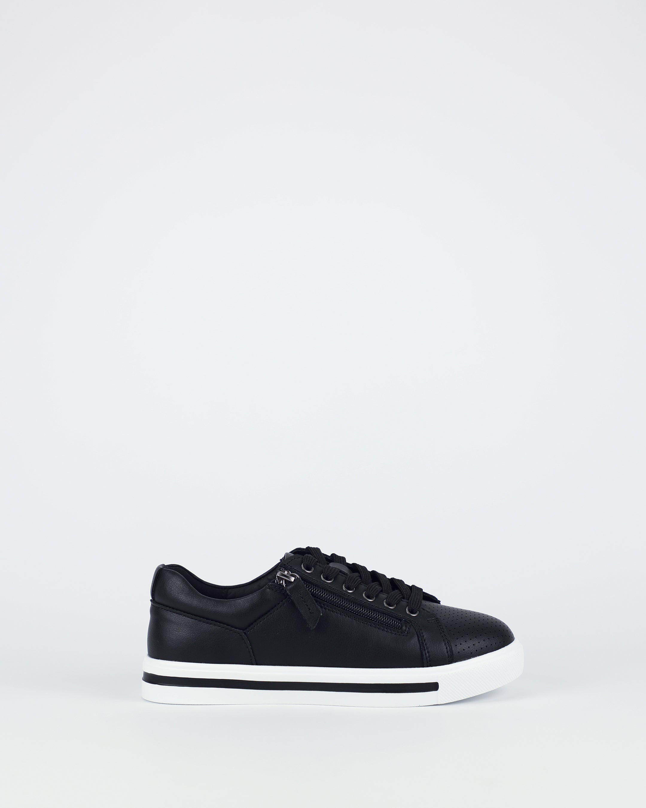 Following the success of our best-selling Kiki, we are pleased to introduce New Kiki, designed with the same classic style and an enhanced comfort footbed for even more lasting wear. Crafted from soft black leather and finished with a contrasting white sole, it combines everyday ease with timeless sneaker appeal. The functional side zip makes them effortless to slip on and off, while the upgraded Multi Fit inner sole takes comfort to the next level.
