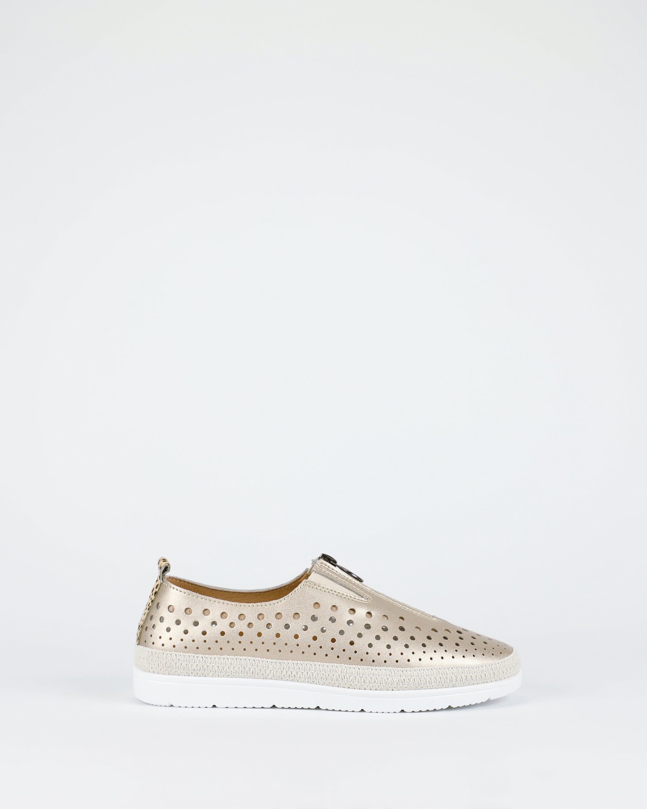 New Mercury brings a touch of understated luxury to everyday wear. Crafted from soft champagne-toned leather with intricate cutwork detailing and finished with a woven espadrille-style trim, it delivers effortless elegance with the same lightweight comfort you love. The functional front zip makes them easy to slip on and off, while the cushioned footbed ensures comfort from morning to evening.