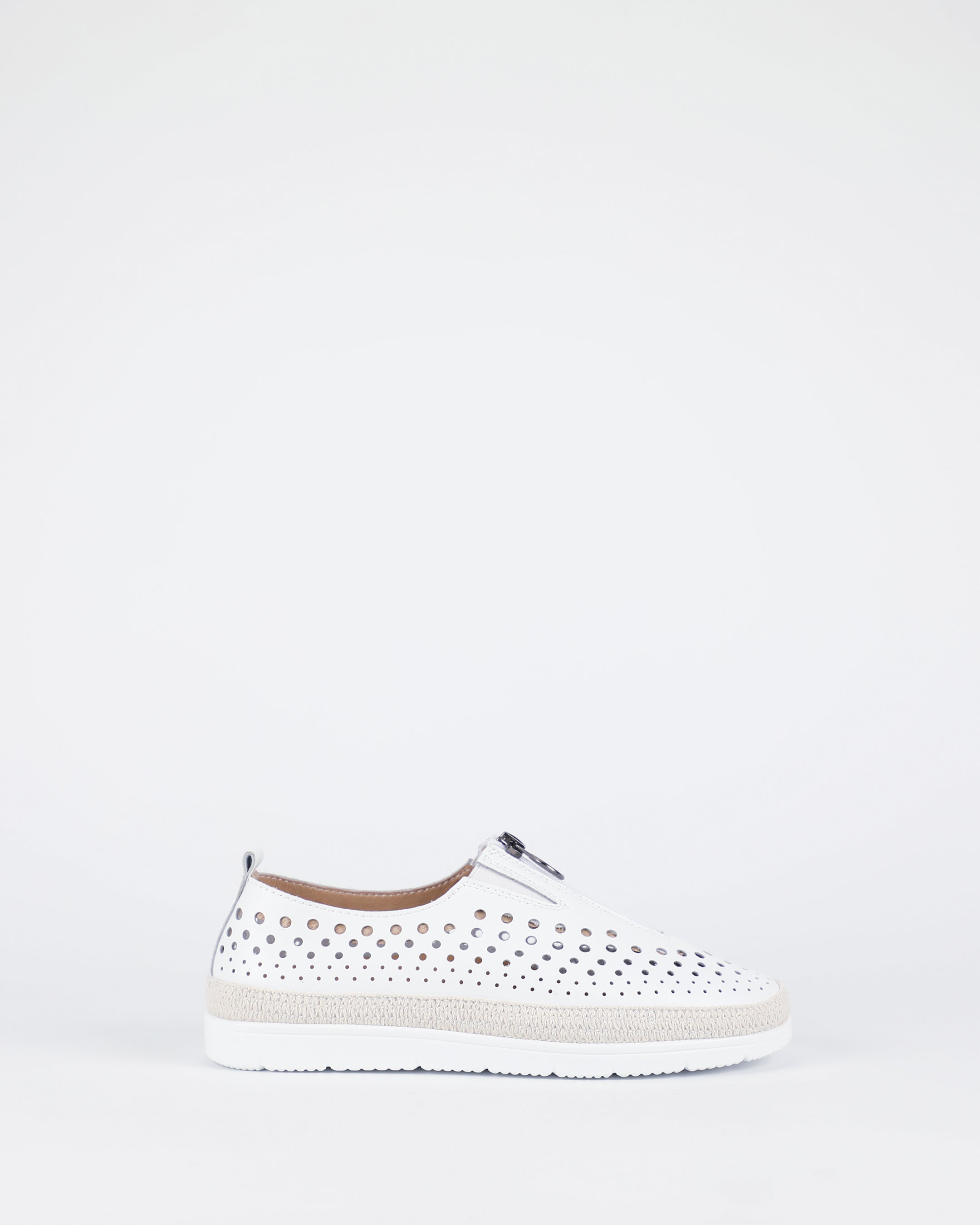 Introducing New Mercury, a fresh style designed for comfort and ease with a fashion-forward edge. Crafted from soft white leather with intricate cutwork detailing and finished with a woven espadrille-style trim, it blends lightweight wearability with chic seasonal style. The functional front zip makes them simple to pull on and off, while the cushioned footbed provides all-day comfort.