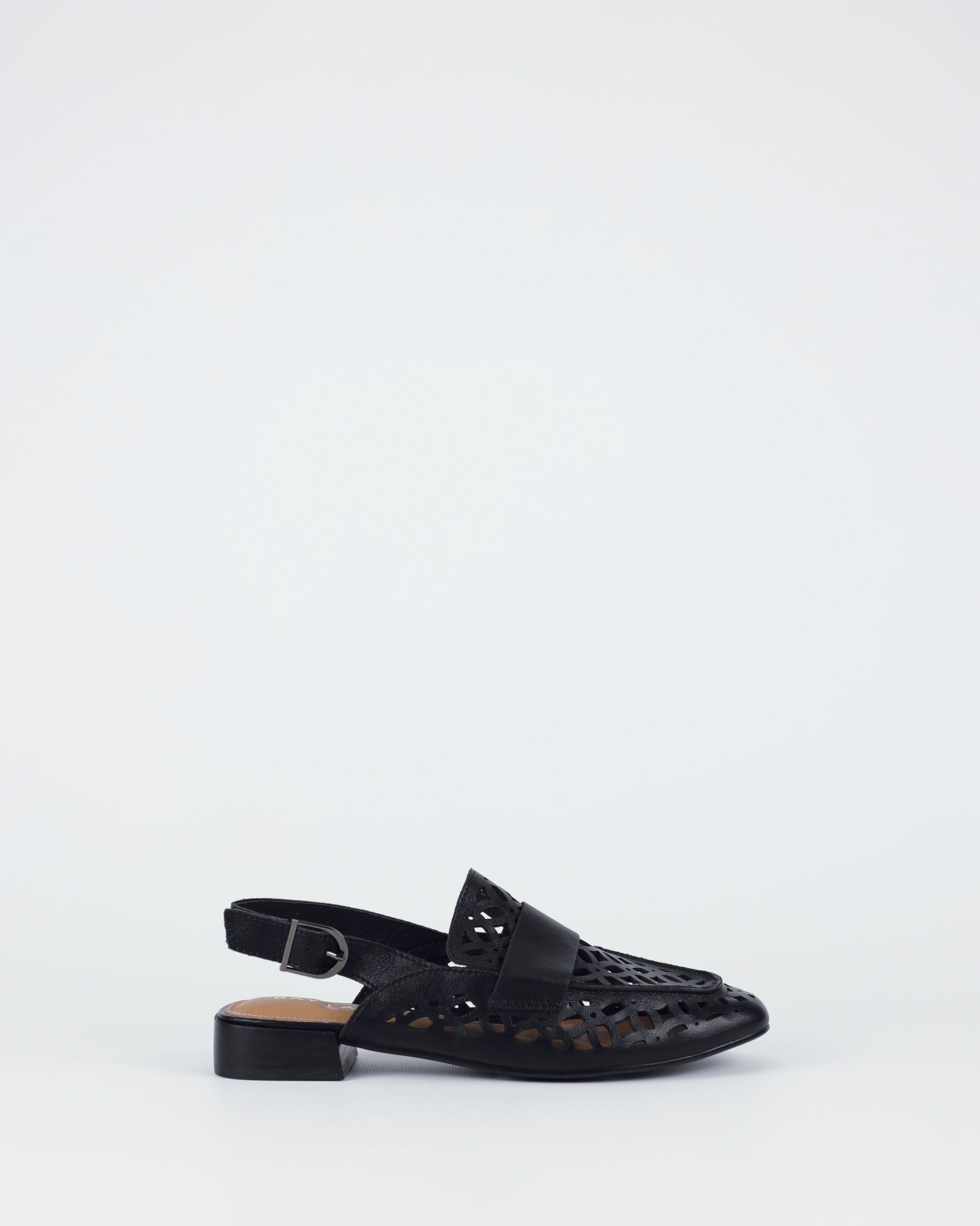 Bring fresh elegance to your wardrobe with Prima in black. Featuring intricate laser-cut detailing and a classic loafer-inspired profile, it balances statement design with everyday versatility. The adjustable slingback strap and cushioned footbed add ease, while the black hue offers a modern touch to the pair.