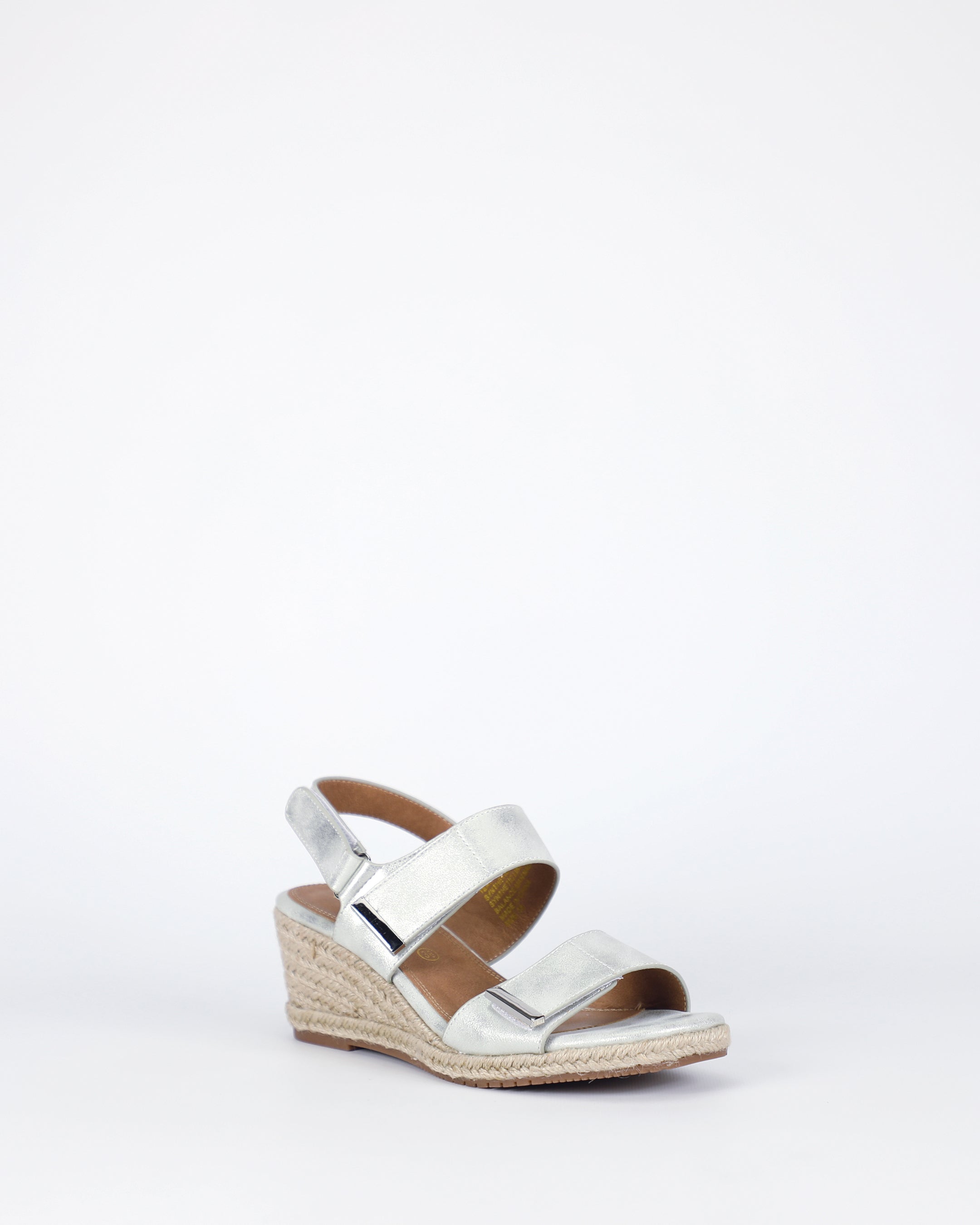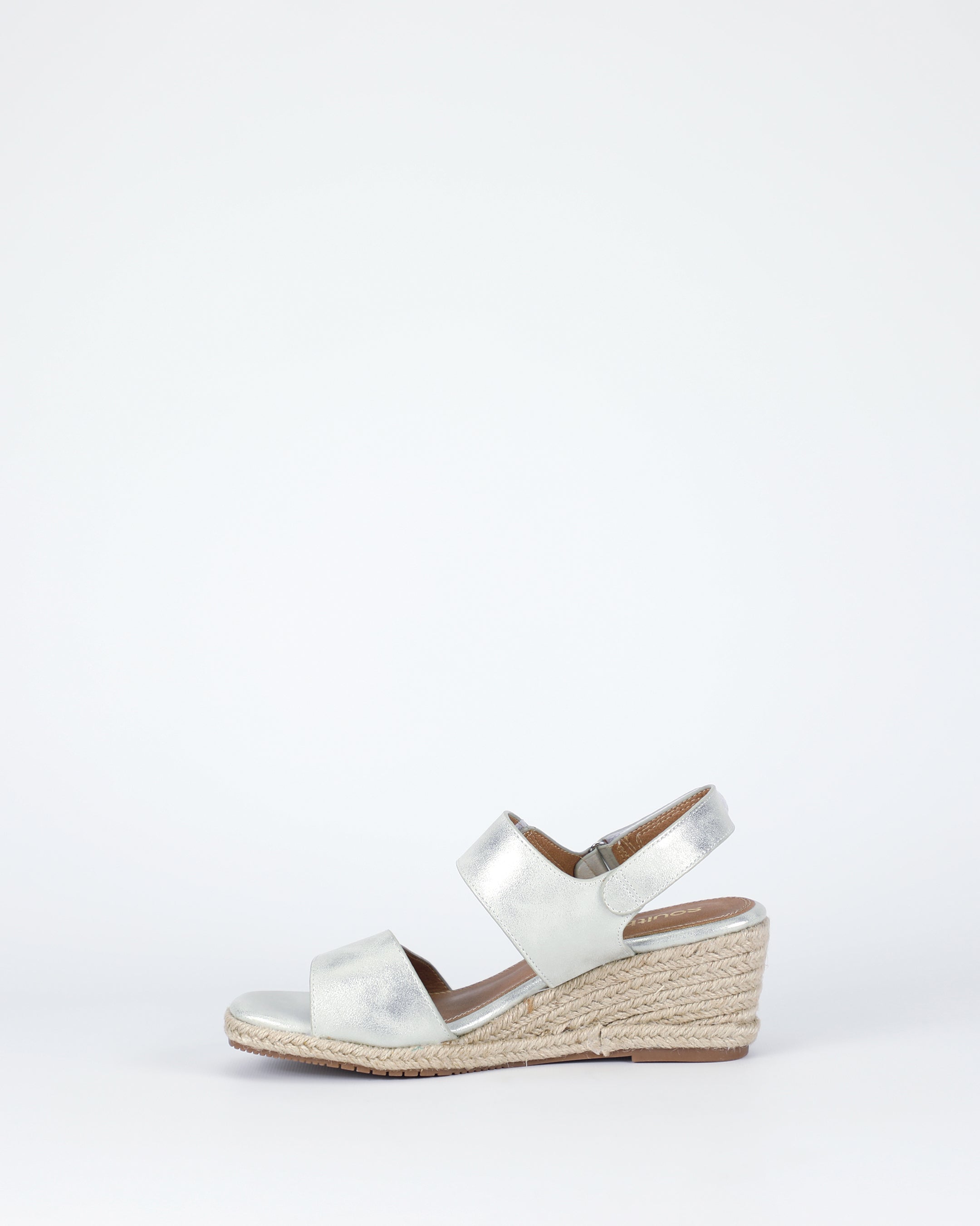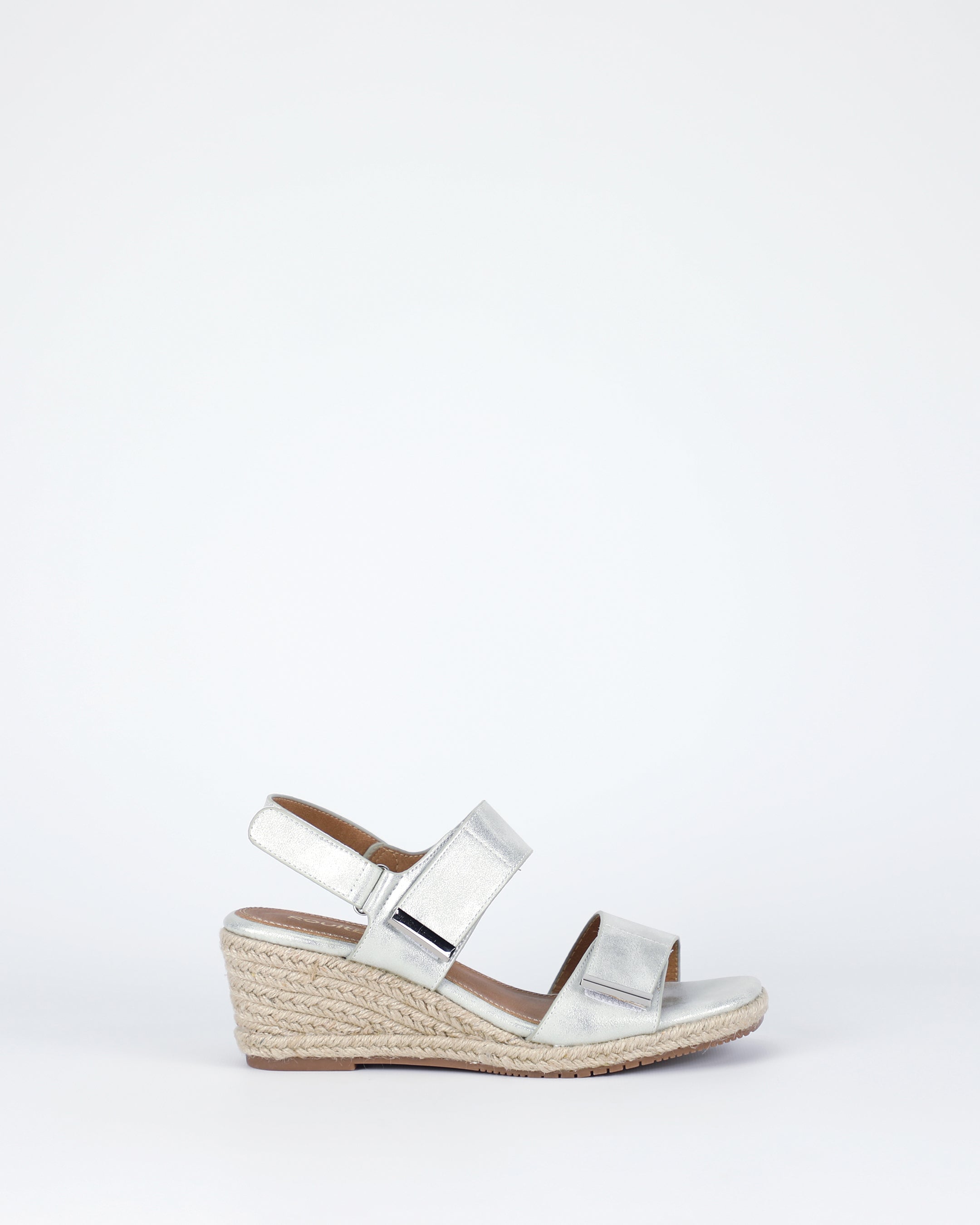 Elevate your everyday look with the Teach wedges in silver shimmer. Combining effortless style and comfort, these sandals feature wide straps with metallic detailing, a cushioned footbed, and a jute-wrapped wedge for gentle height and relaxed elegance.