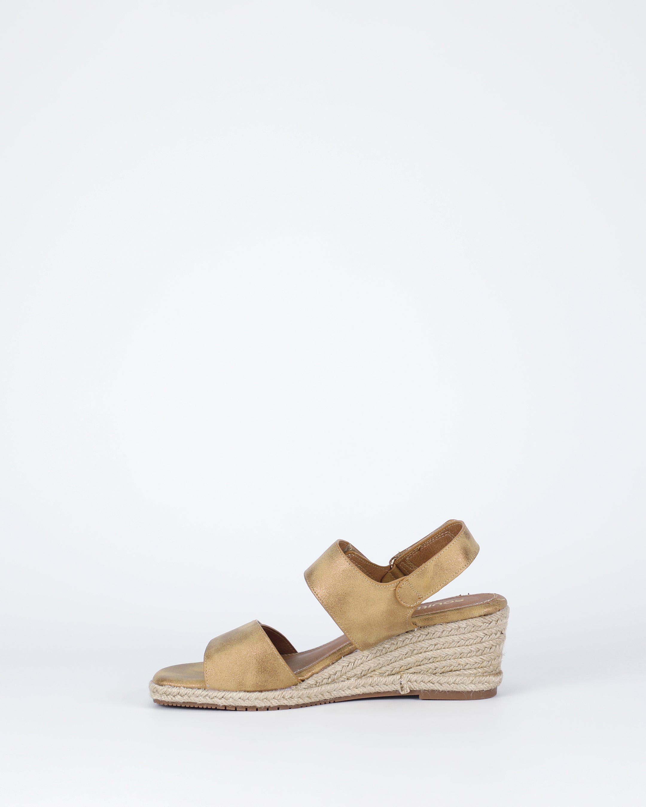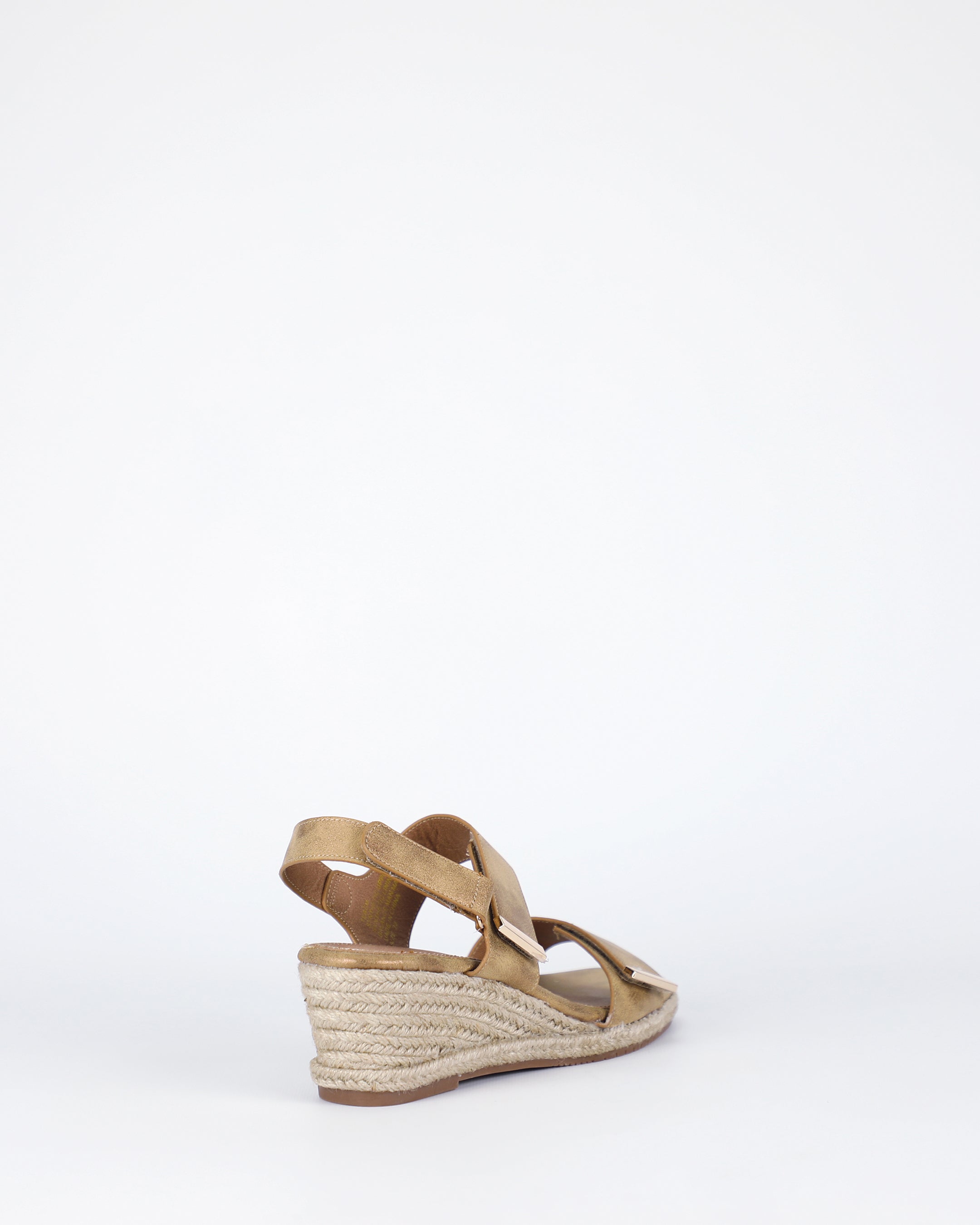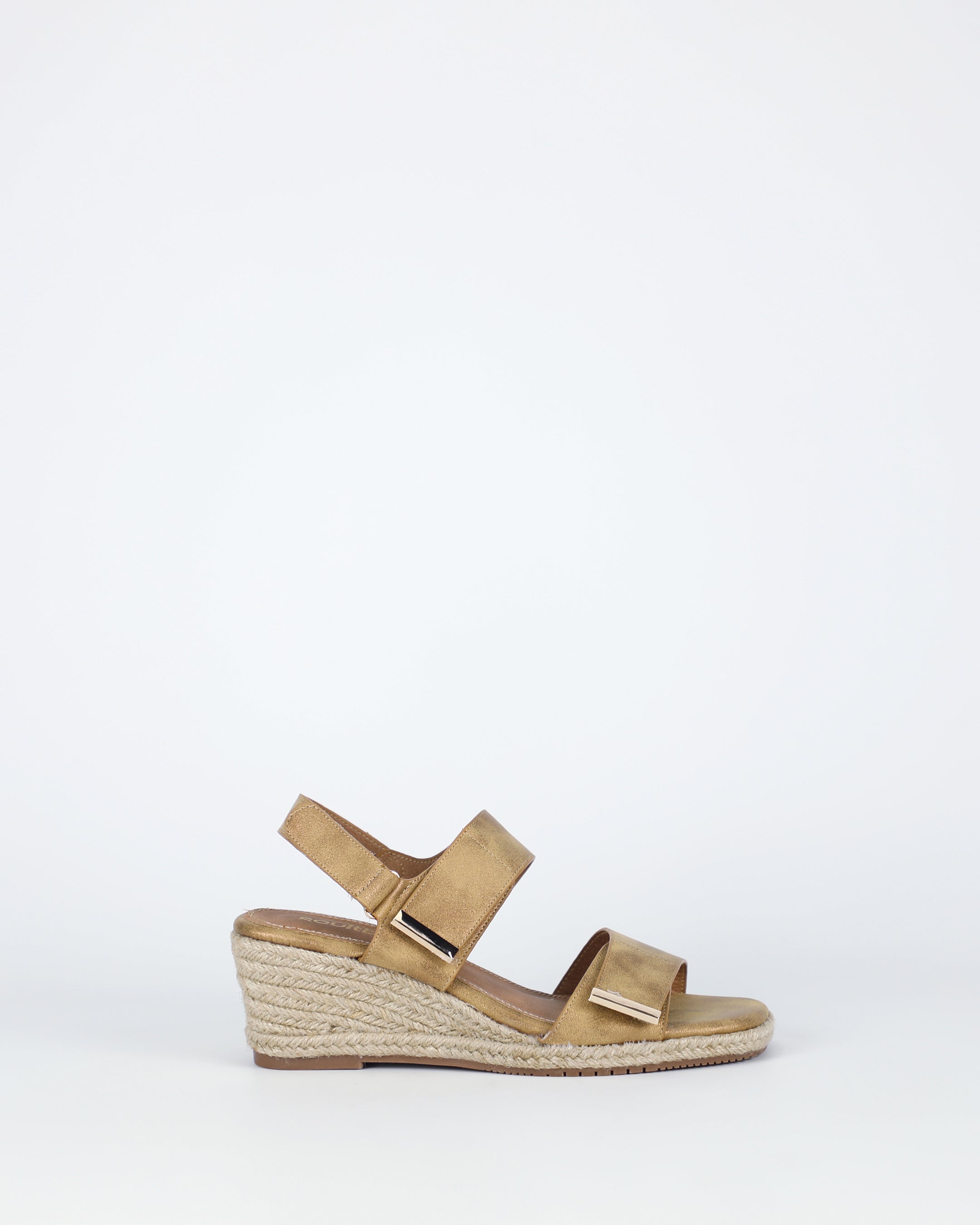 Elevate your everyday look with the Teach wedges in tan. Combining effortless style and comfort, these sandals feature wide straps with metallic detailing, a cushioned footbed, and a jute-wrapped wedge for gentle height and relaxed elegance.