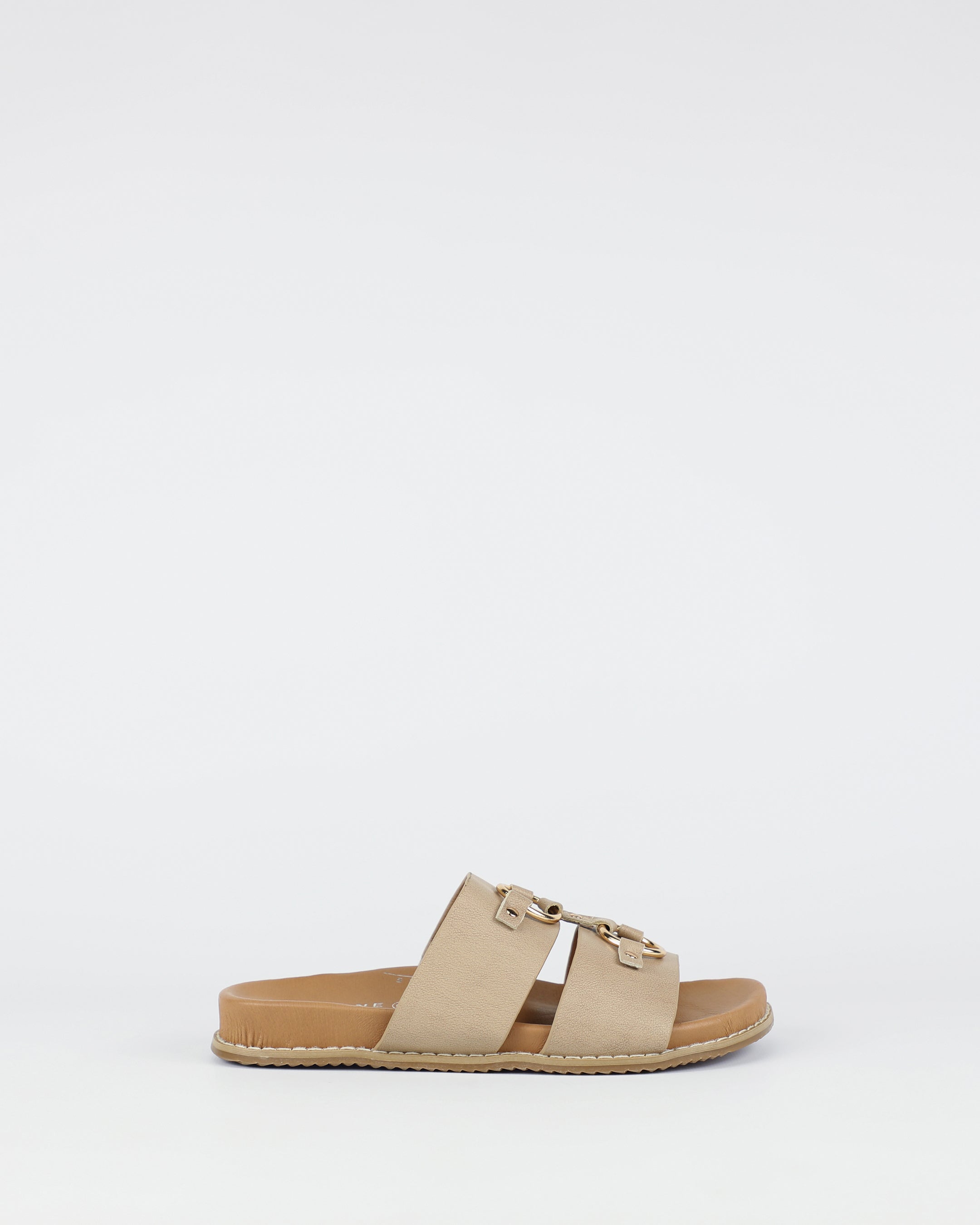 Step into modern ease with Zuma in latte. Featuring wide double straps with polished gold hardware, this sandal delivers a sleek look with everyday versatility. The cushioned footbed and lightweight sole ensure comfort, making it a staple for warm-weather dressing.